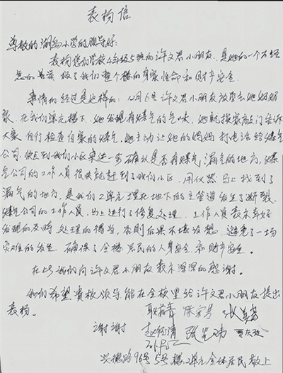 “尊敬的湖岛小学领导:表扬您们学校四年级五班的许文君小朋友,是她的一个不经意的善举……在我们单元楼下,她发现有煤气的气味,她就挨家敲门告诉大家,自行检查自家的燃气。还打电话给煤气公司,快点到我们小区来进一步确认是否有燃气泄漏的地方……工作人员表示幸好发现及时,处理得当,否则后果不堪设想,确保了全楼居民的人身安全和财产安全。在此我们向许文君小朋友表示感谢。”收到来自社区居民写来的表扬信,许文君感到十分意外,尤其看到表扬信最后还有79位邻居的亲笔签名,她心里更是感动不已。
