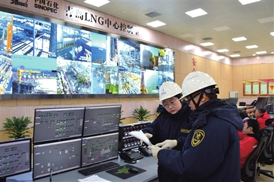 海关关员在进口液化气控制室了解储罐储气情况。海关供图