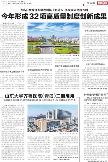 早报12月26日讯 12月26日,市政府新闻办召开新闻发布会,介绍2023年青岛自贸片区高质量制度创新成果情况。今年以来,在市委财经办统筹领导、市自贸领导小组办公室有力组织下,青岛自贸片区与各部门通力协作,实践形成了32项高质量制度创新成果,其中国务院推广1项,国家部委推广2项、国家部委备案2项,黄河流域九省(区)推广5项,山东省政府推广22项,全面完成了目标任务。