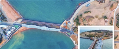 建设过程中,崂山区城市管理局组织项目各方优化方案,编制《游客低影响施工方案》,仅用10天时间完成东侧钢便桥施工,在五一假期前对游客游览路线进行及时调整,做好游客疏导,保证游客安全。同时,针对现场存在的风浪难题,项目部创新采用“堤坝围堰+防水套箱”工艺,克服了海潮影响和水下作业困难,实现承台24小时全天候作业,用时25天完成了全部11个承台及墩柱施工,极大压缩了桥梁建设周期。