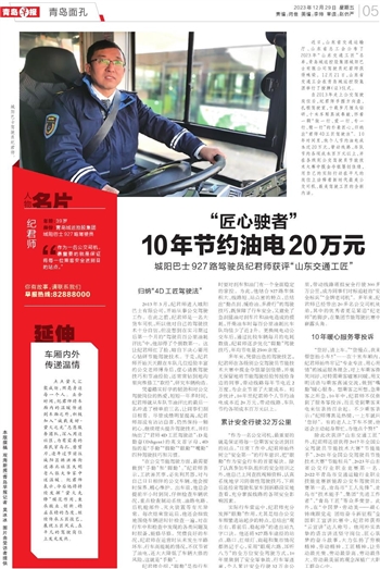 除此次获评“山东交通工匠”外,纪君师还曾获得2017年全国公交驾驶员节能技术大赛“节能能手”、2021年全国公交驾驶员节能技术大赛“节能标兵”、2023年山东省公交行业职业竞赛第一名、2022年青岛市交通运输行业职业技能竞赛新能源公交车驾驶员比赛第一名、青岛市“工人先锋”、青岛市“技术能手”、集团“先进工作者”、“青岛工匠”等众多荣誉。此外,在“中国梦·劳动美——凝心铸魂跟党走 团结奋斗新征程”全国职工宣讲比赛中,纪君师获得“云宣讲”达人称号。他用朴实真挚的语言讲述坚守岗位、匠心筑梦的奋斗故事,大力弘扬了劳模精神、劳动精神、工匠精神,让劳动最光荣、劳动最崇高、劳动最伟大、劳动最美丽的观念深植广大职工群众心中。