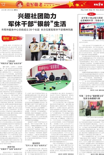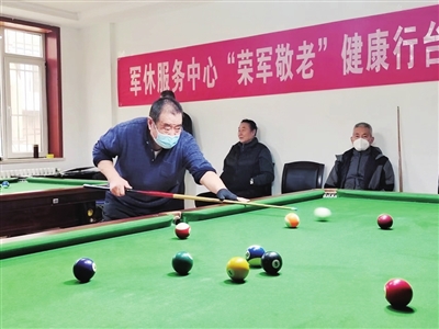 与此同时,台球社团同样为追求“老有所学”的军休干部提供了平台。83岁高龄的马老是台球社团团长,今年5月台球社团成立之初,他连续两周为新接触台球的军休干部传授台球基础知识。炎炎夏日,三九寒冬,力学不倦。在团长的带领下,台球社团的军休干部每月进行比赛,并于近日在市军休服务中心举行2023年度“荣军敬老”健康行台球年终总决赛,决出年度冠亚季军。“中心为我们营造了良好的比赛环境。作为一名台球爱好者,我希望这种比赛能够持续举办下去,同时也邀请更多爱好台球的军休干部一起加入进来,向健康快乐休养生活出发!”团长马老说。