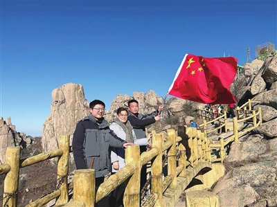 巨峰管理服务中心职工在崂顶高举五星红旗。