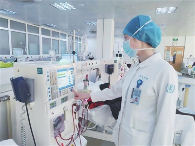 元旦当天青大附院市南院区血透中心的医护人员像往常一样,一大早就出现在自己的工作岗位上,开始了一天的忙碌。和其他科室不同,这里的患者需要通过规律透析来维持生命,因此血透中心必须做到365天不停摆。“透析过程中,要时刻监测病人的生命体征,注意血流量的变化、静脉压的变化,透析液的温度、流量、浓度、凝血,随时做好各种危急情况的防范和处理工作。”护士长李海娜告诉记者。