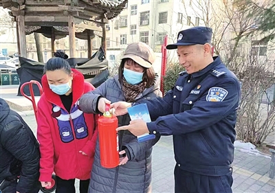 李嘉顺(右一)在给居民讲解灭火器的使用方法。