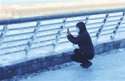 12月16日 岛城迎来极端寒潮天气,在金茂湾购物中心北侧和西侧的海滨栈道,拍打上岸的海浪在护栏上结成冰挂。