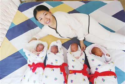 1月31日 市民王蕊生下“一龙三凤”后,随着老三舒舒的健康出院,“擎淇舒婳”四胞胎迎来出生后首次“同框”。
