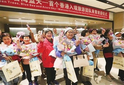 2月12日 来自中国香港的23名游客抵达青岛,迎接他们的是笑脸、鲜花和青岛元素伴手礼。这是“沉寂”3年后我市迎来的山东首个入境旅游团队。