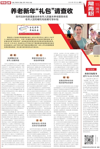 青岛是人口老龄化程度较高的城市,全市60周岁及以上老年人238万人,老龄化率达到23%。为深入实施积极应对人口老龄化国家战略,进一步推动实现“老有所养”,加快建成具有青岛特色的基本养老服务体系,2023年12月28日,市政府办公厅印发《关于推进基本养老服务体系建设的实施意见》,这份“新年礼物”具体包含哪些内容?老年人可以享受哪些更优质的服务体验?其主要内容和特色亮点引发关注。