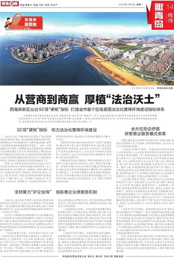 法律服务是推动惠企政策直达快享、落地落实的“催化剂”和“助燃剂”。近日,青岛西海岸新区印发《青岛西海岸新区法治化营商环境建设指标体系》,以92项“硬核”指标着力打造营商环境“法治招牌”。据悉,该指标体系是青岛市首个区级层面的法治化营商环境建设指标体系,标志着西海岸新区在法治化营商环境的建设道路上再次迈出重要一步。