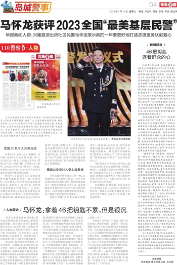 为大力选树宣传在火热的公安基层一线涌现出的先进典型,弘扬伟大建党精神,激励广大公安民警奋进新征程、建功新时代,1月9日,在第四个中国人民警察节来临之际,中央宣传部、公安部向全社会宣传发布2023“最美基层民警”先进事迹。青岛早报新闻人物,青岛市公安局市北分局兴隆路派出所社区民警、一级高级警长马怀龙等20名民警榜上有名。此前,青岛交警李涌获得2021“最美基层民警”称号。