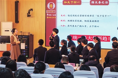 青岛旅游学校教师陈娜带来课程《秦朝统一多民族封建国家的建立》。“在课堂教学中,我设置了任务情境:‘种花(中华)家’文化旅行社开发中国世界文化遗产类研学课程,并以此为主线,利用VR技术沉浸式体验秦始皇陵及兵马俑坑,了解其概况,引领学生走进文遗;之后,结合任务清单,学生以小组形式派出代表,以文遗小导游的身份进行成果汇报,将遗产介绍、文物解析与秦统一六国的背景、巩固统一的措施、二世而亡的原因有机串联;接着,我抛出问题‘秦朝大一统理念的现实意义’,师生共同探究,增强对国家统一的认同感及责任感,做到于无声处育人。”