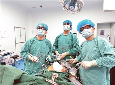 卢云(左一)在用3D腹腔镜技术给病人做结直肠肿瘤手术。