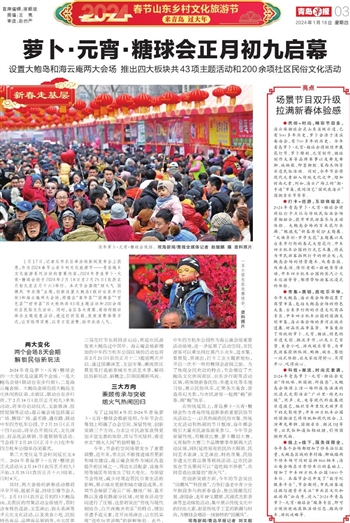 1月17日,记者从市北区举办的新闻发布会上获悉,作为2024春节山东乡村文化旅游节——青岛城乡文化旅游系列活动的重要内容,2024年青岛萝卜·元宵·糖球会将于2024年2月18日至2月25日(农历正月初九至正月十六)举行。本次节会围绕“烟火气 国潮风 市北情”主题,创新设置大鲍岛(联动台东步行街)和海云庵两大会场,将推出“喜年荟”“国潮荟”“百艺荟”“好市荟”四大板块共43项主题活动和200余项社区民俗文化活动。同时,全区各大商圈、商场将联动举办主题优惠活动,通过打折促销、发放消费券等方式,让百姓得实惠、以节日促消费、给市北添人气。
