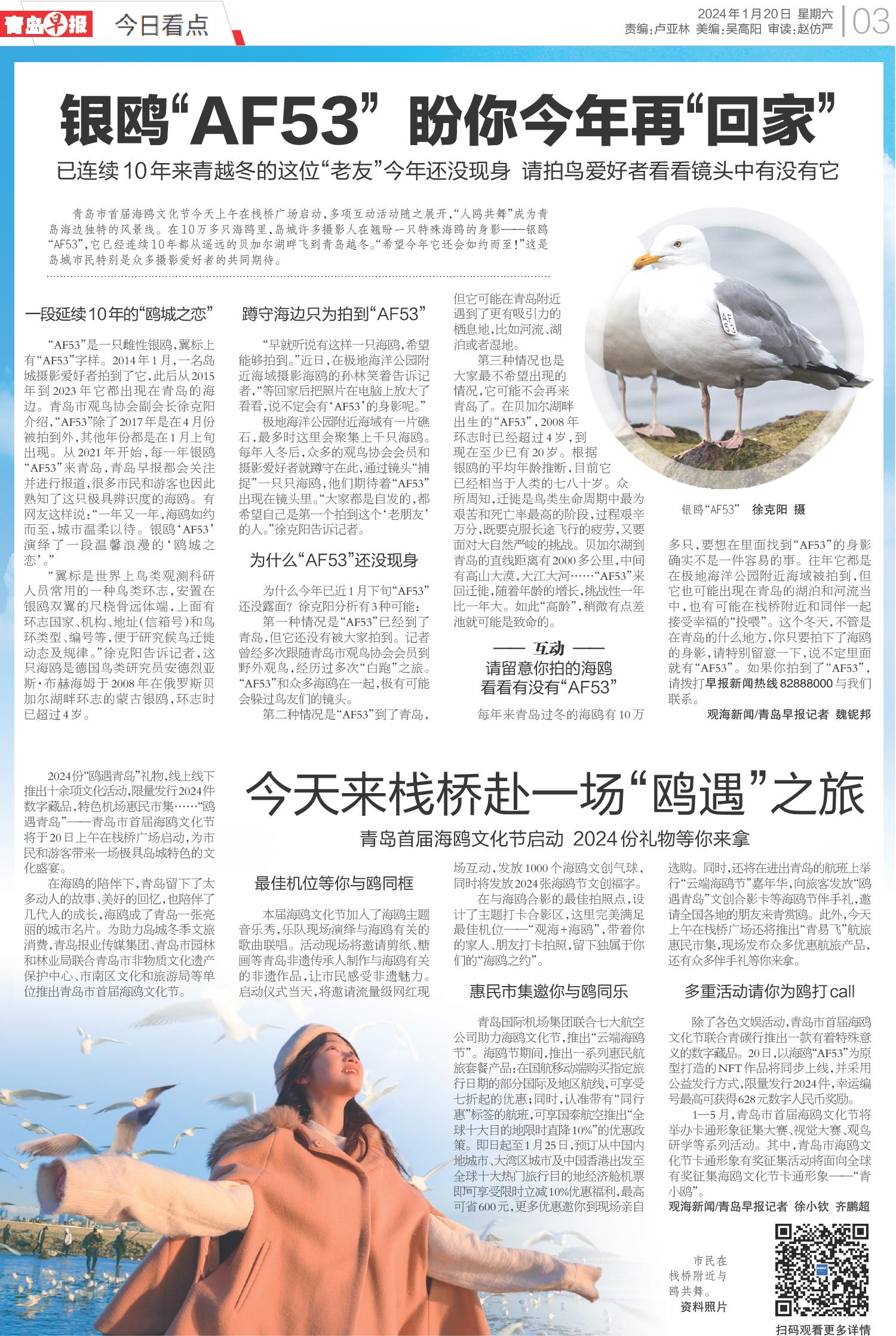 “AF53”是一只雌性银鸥,翼标上有“AF53”字样。2014年1月,一名岛城摄影爱好者拍到了它,此后从2015年到2023年它都出现在青岛的海边。青岛市观鸟协会副会长徐克阳介绍,“AF53”除了2017年是在4月份被拍到外,其他年份都是在1月上旬出现。从2021年开始,每一年银鸥“AF53”来青岛,青岛早报都会关注并进行报道,很多市民和游客也因此熟知了这只极具辨识度的海鸥。有网友这样说:“一年又一年,海鸥如约而至,城市温柔以待。银鸥‘AF53’演绎了一段温馨浪漫的‘鸥城之恋’。”