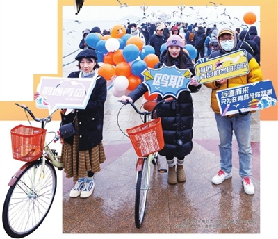 栈桥上, 10辆复古自行车牵引着蓝、白、橘相间的1000个海鸥文创气球,形成一道亮丽的风景。市民和游客一边游玩一边观海赏鸥,现场欢声笑语不断,一派热闹的景象。
