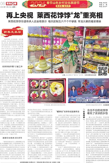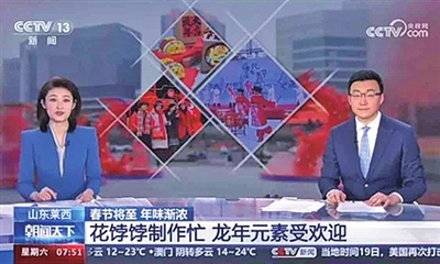 “元旦过后,央视多个栏目就开始寻找传统年味儿,莱西花饽饽这次在中央电视台新闻频道《朝闻天下》栏目又播出了。”迟金艳介绍,在胶东地区最具年味的民俗就是蒸上几锅大馒头。在中国文化中,龙被视为祥瑞的象征, 今年正好是龙年,带有龙元素的花饽饽备受消费者青睐。此次《朝闻天下》栏目以《花饽饽制作忙 龙年元素受欢迎》为题,对莱西面塑制作技艺——莱西花饽饽的制作过程进行了详细介绍,引起全国不少观众的关注。