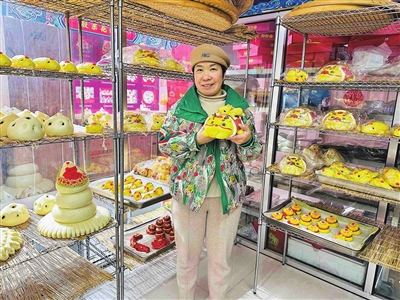 “春塑凤凰戏牡丹,夏塑蜻蜓沾荷莲,秋塑蝴蝶恋菊花,冬塑喜鹊报平安。”迟金艳凭借一双巧手,将有300多年历史的莱西花饽饽制作技艺传承下来并发扬光大。为迎接龙年新春,喜我我食品有限公司的面点师们做出了许多龙年元素的花饽饽。迟金艳介绍,莱西花饽饽除了结合传统节日进行创意造型,平时也会注重增添一些时尚元素,比如一款可以“以假乱真”的苹果造型花饽饽,“好多朋友看到后会说,‘给我削个苹果吃’。”还有用花饽饽做成的玫瑰花篮,更是深受年轻人喜爱。