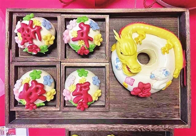 俗话说,“过了腊八就是年”,寓意美好的花饽饽把年味揉进了面里、做在了造型里。在位于莱西市的青岛喜我我食品有限公司里,面点师先将手中的面团反复揉搓,再用果蔬汁调色,最后再揉捏成型,只见花饽饽披上“红衣”,瞬间一只可爱的“醒狮龙”就活灵活现地出现在记者眼前。“你看这个‘醒狮龙’,它肚子里还有元宝,寓意招财进宝。今年是龙年,愿我们龙的传人在龙年飞黄腾达。”公司总经理、莱西市花饽饽非遗传承人迟金艳说。迟金艳告诉记者,临近春节,花饽饽每天制作五六千个都不够卖。