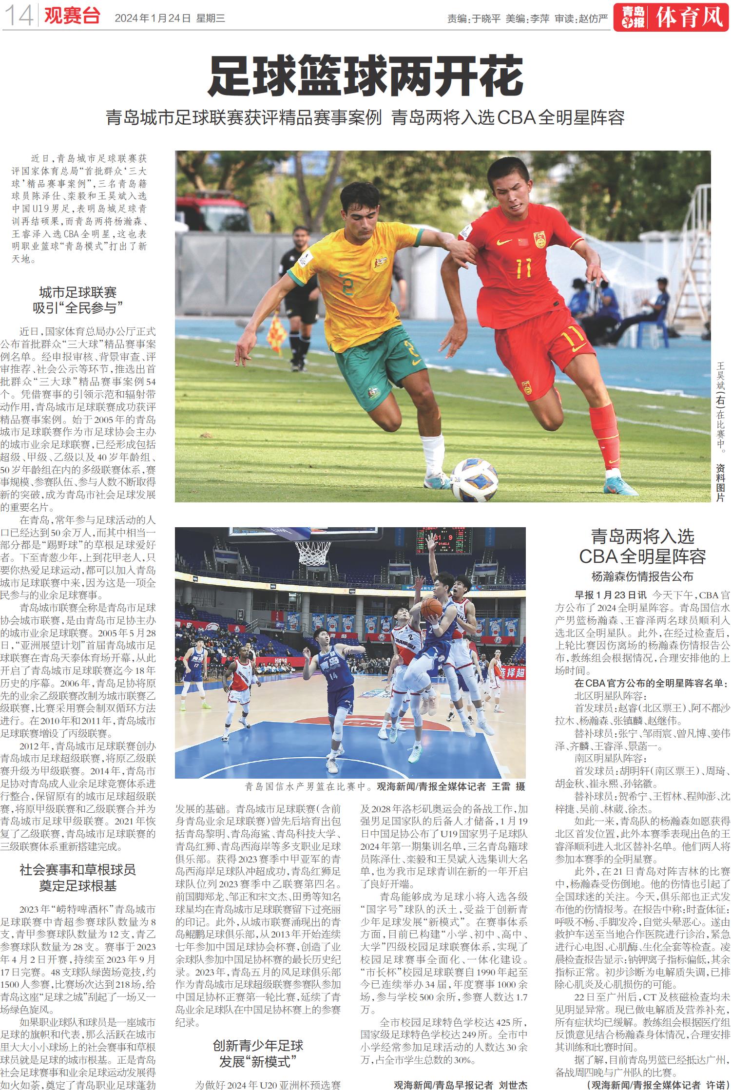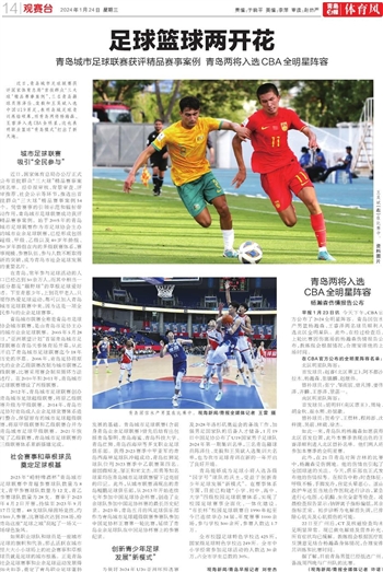 近日,青岛城市足球联赛获评国家体育总局“首批群众‘三大球’精品赛事案例”,三名青岛籍球员陈泽仕、栾毅和王昊斌入选中国U19男足,表明岛城足球青训再结硕果,而青岛两将杨瀚森、王睿泽入选CBA全明星,这也表明职业篮球“青岛模式”打出了新天地。