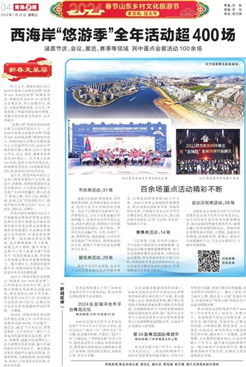 “会展之滨”是青岛西海岸新区着力打造的四张名片之一。在2024年度重点会展活动暨“西海岸100·2024悠游季”新闻发布会上,西海岸新区会展业发展促进中心主任崔西军介绍,2024年西海岸新区精心策划,全年计划举办节庆、会议、展览、赛事等各类活动400场以上,其中重点活动100余场,包括31场节庆类活动、29场展览类活动、14场赛事类活动以及28场会议论坛类活动。