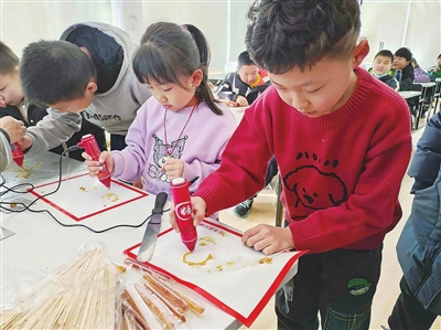 孩子们动手制作糖画。王哥庄街道办事处供图