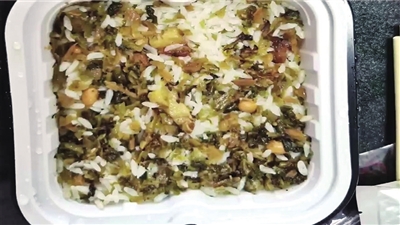 右图:咖喱鸡肉口味的自热米饭难觅鸡肉。视频截图