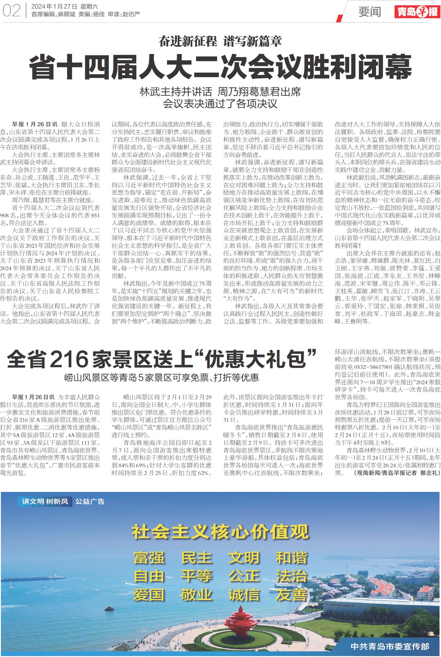 早报1月26日讯 为丰富人民群众假日生活,营造欢乐喜庆的节日氛围,进一步激发文化和旅游消费潜能,春节前后全省216家A级旅游景区推出免票、打折、联票优惠、二消优惠等优惠措施,其中5A级旅游景区12家、4A级旅游景区93家、3A级及以下旅游景区111家。青岛市共有崂山风景区、青岛海底世界、青岛森林野生动物世界等5家景区推出春节“优惠大礼包”,广邀市民游客前来观光游览。