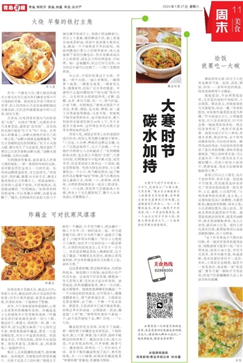大寒节气是严冬的最后一个节气,民谚有云:“小寒大寒,无风自寒。”碳水化合物能够为人体提供充足的热量,各种碳水美食充盈着我们的味蕾,也温暖着我们的身心。吃一口烫嘴的地瓜,吸溜一碗热乎乎的汤面,咬一口冒油的灌汤包,来一个油汪汪肉乎乎的火烧,消散大寒的寒凉之气,一口家常的优质碳水就能做到。