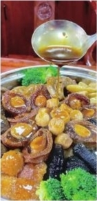 在“吃”的方面,最具粤味的招牌年菜当属盆菜。盆菜是广州人年夜饭常吃的菜,将很多食物一起烧制,然后放在一个大木盆里全家一起吃,是逢年过节、婚嫁添丁、寿诞喜庆之日必备。尤其是新年伊始,亲朋汇聚共享盆菜,更预示这一年都将财源广进、吉祥富贵、诸事顺利,而且吃得越多,福气越多,吃得越饱,一年都好。