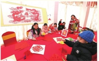 小朋友现场体验剪纸艺术。