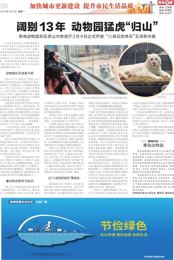 与青岛市民阔别13年的动物园虎山内参观厅开放了!因馆舍修缮,在外寄养一年半的狗熊回来了。2月4日,修缮一新的青岛动物园东园区开始试运营。“我们将在2月9日正式开放,给市民带来新春的快乐,让‘八块五的快乐’再增加些乐趣。”青岛动物园相关负责人告诉记者。另据了解,受大雪天气影响,今日青岛市动物园临时闭园一天。