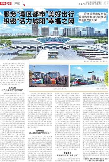 近1000辆营运车辆、80条公交线路及山东省首条现代有轨电车线路,近1600公里线路总长,惠及沿途百万居民……目前,城阳巴士公司坚持以新发展理念为引领,全力推动“2261—3355”高质量发展体系建设,坚持“党建”“经营管理”两个主线,做强“数字赋能”“创新驱动”两个引擎,深耕“强根”“铸廉”“塑魂”“增收”“降本”“提效”六个方向,积极实施卓越绩效管理模式,在青岛市公交企业质量信誉考核工作中被评定为AAA级,获得全国交通运输公益文化建设优秀单位、山东省档案工作业务建设示范单位、青岛市“学习强国”学习平台推广使用工作突出贡献单位、第十一届城阳区“区长质量奖”、城运安全管理标杆示范单位等一系列荣誉,陆续有4个基层分公司被评为全国交通行业五星级现场,“萤火之光”品牌连续四届登上“交通强国 品牌力量”优秀文化品牌榜单,向着实现“建设全国一流公交综合企业”的总体目标稳步迈进。下一步,城阳巴士公司将积极参与建设青岛城运北部智慧交通中心,在公交智能化调度运营、多元化智慧服务上持续发力,以科技数智赋能市民美好出行,并用3年时间对高重复线路进行精简整合,结合城阳区道路实际情况打造“五横五纵”公交干线网。