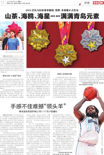 早报2月5日讯 2月5日上午,海尔·2024青岛马拉松组委会举行了第二次新闻发布会,发布了赛事路线、奖牌和参赛服。本次赛事延续青马经典路线,让广大跑友脚踩“最美赛道”饱览“山海城湾”;完赛奖牌总体形象设计为青岛市市花山茶,绽放的花朵象征青马赛事的圆满;赛事服装在设计中围绕青岛市文化特色,将青岛的开放、现代、活力贯通于服饰之中。