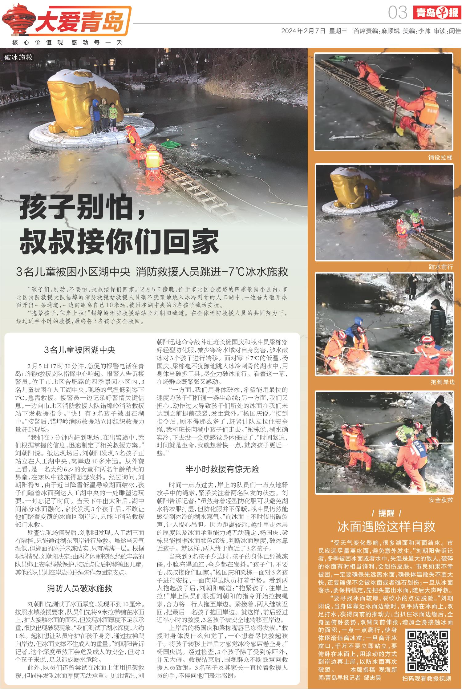 “孩子们,别动,不要怕,叔叔接你们回家。”2月5日傍晚,位于市北区合肥路的四季景园小区内,市北区消防救援大队错埠岭消防救援站救援人员毫不犹豫地跳入冰冷刺骨的人工湖中,一边奋力砸开冰面开出一条通道,一边向距离自己10米远、被困在湖中央的3名孩子喊话安抚。