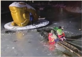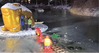 “我们在7分钟内赶到现场,在出警途中,我们根据掌握的信息,迅速制定了相关救援方案。”刘朝阳说。抵达现场后,刘朝阳发现3名孩子正站立在人工湖中央,离岸边10多米远。从外貌上看,是一名大约6岁的女童和两名年龄稍大的男童,在寒风中被冻得瑟瑟发抖。经过询问,刘朝阳得知,由于近日降雪低温导致湖面结冰,孩子们踏着冰面到达人工湖中央的一处雕塑边玩耍,一时忘记了时间。当天下午出太阳后,湖中间部分冰面融化,家长发现3个孩子后,不敢让他们踏着变薄的冰面回到岸边,只能向消防救援部门求救。
