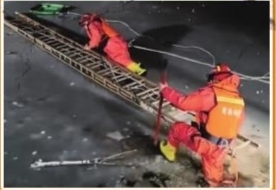 刘朝阳先测试了冰面厚度,发现不到10厘米。按照水域救援要求,队员们先将9米拉梯铺在冰面上,扩大接触冰面的面积,但发现冰面厚度不足以承重,很快出现破裂现象。“我们测试了湖水深度,大约1米。起初想让队员守护在孩子身旁,通过拉梯爬向岸边,但冰面支撑不住成人的重量。”刘朝阳告诉记者,这个深度虽然不会危及成人的安全,但对3个孩子来说,足以造成溺水危险。