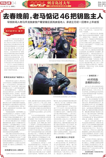 自上个月荣获全国“最美基层民警”称号后,青岛早报新闻人物、青岛市公安局市北分局兴隆路派出所社区民警马怀龙的“档期”就安排得满满当当,这名揣着46把居民家钥匙、守护社区16年的“辖区管家”得到了全国人民的关注。尤其在收到中央广播电视总台现场观看央视龙年春晚的邀请函后,老马更是开启了青岛、北京多次往返奔波的行程。对于受邀现场看春晚这件事,马怀龙打心眼里高兴,但是他心里最惦记的依然是手中46把钥匙的主人。2月5日,记者在兴隆路派出所见到了刚返回青岛不久的马怀龙,他正准备和志愿者一同去挨家挨户看望帮扶家庭。