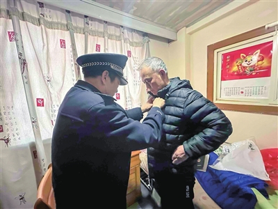 今年78岁的赵桂清是一名孤寡老人,他现在住的养老院是马怀龙帮忙安排的。“你今天吃药了吗?如果药没了就和我说,我去给你取。”马怀龙关心地问道。记者了解到,除了按时上门看望外,马怀龙还会帮赵桂清去医院取药,志愿服务队的志愿者也经常为赵桂清“改善伙食”。“今天过来还给你带了件新衣服,你穿上看看怎么样?”马怀龙拿出特意为老人买的羽绒服,帮老人穿上。“衣服很合身,谢谢马警官!”提起马怀龙这么多年对自己的照顾,赵桂清心中的感激溢于言表,“他很照顾我,经常没事就来看我,待我就像亲人一样,我很感激他。”