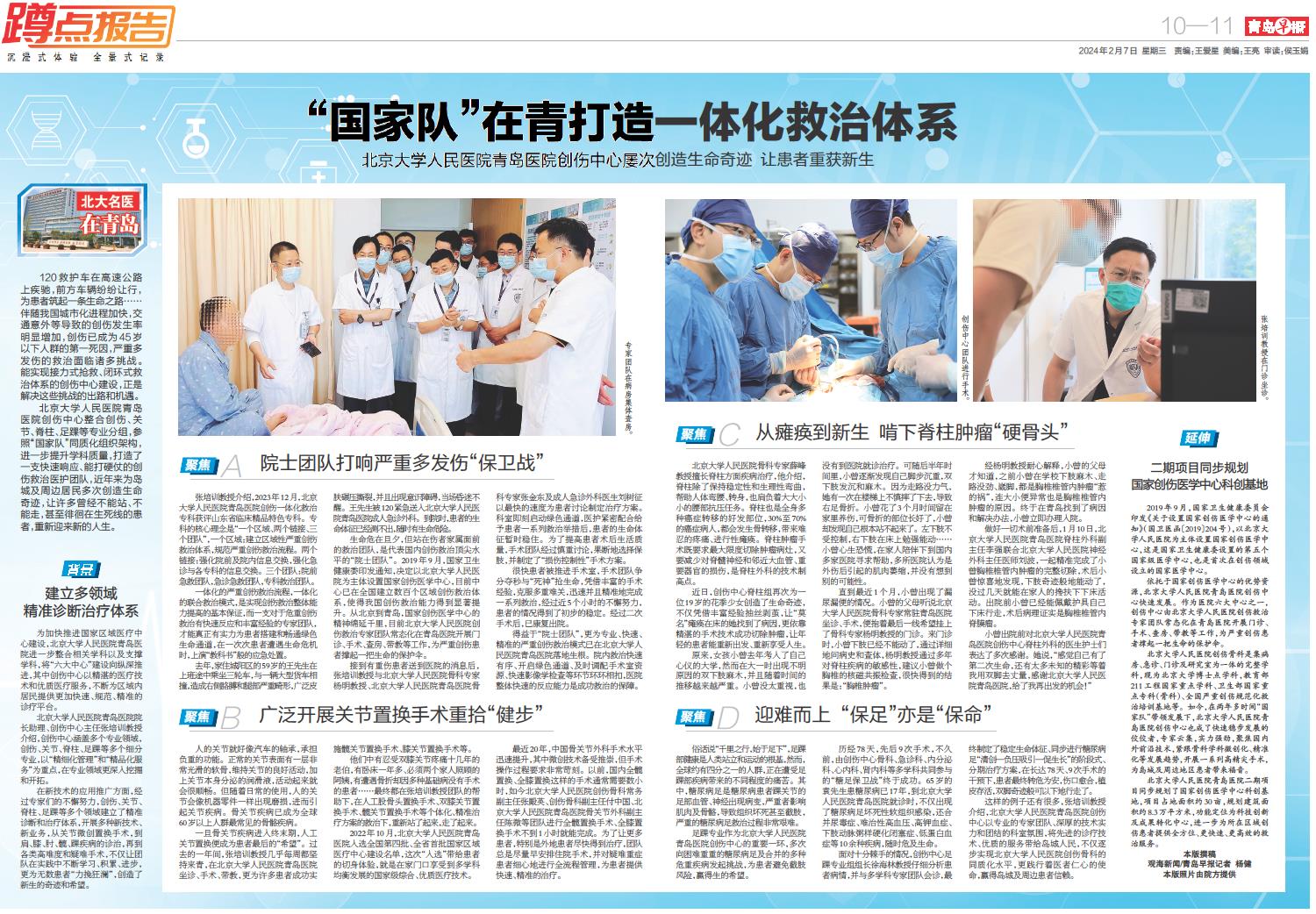 生命危在旦夕,但站在伤者家属面前的救治团队,是代表国内创伤救治顶尖水平的“院士团队”。2019年9月,国家卫生健康委印发通知,决定以北京大学人民医院为主体设置国家创伤医学中心,目前中心已在全国建立数百个区域创伤救治体系,使得我国创伤救治能力得到显著提升。从北京到青岛,国家创伤医学中心的精神绵延千里,目前北京大学人民医院创伤救治专家团队常态化在青岛医院开展门诊、手术、查房、带教等工作,为严重创伤患者撑起一把生命的保护伞。