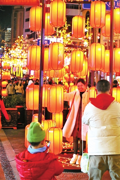 市民在中山路上的花灯里拍照。