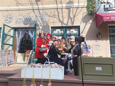 市民苏女士(右一)和老同学在老城区拍照打卡。