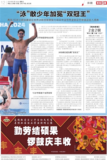 继2月12日夺得2024世界泳联世锦赛男子4×100米接力金牌后,北京时间2月17日凌晨,16岁青岛小将张展硕在男子4×200米自由泳接力决赛中获得冠军,帮助中国游泳队锁定巴黎奥运会该项目的入场券,青岛“泳”敢少年也成为世锦赛“双冠王”。