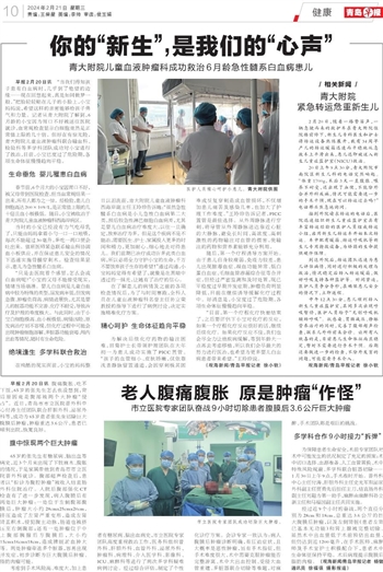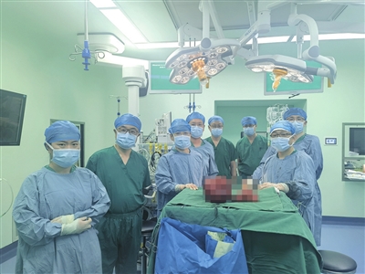 经过近9个小时的奋战,两个直径分别为28cm和18cm、总重达3.6公斤的巨大腹膜后肿瘤,以及左侧肾脏(患者左肾已基本无功能)和肾上腺被完整切除。虽然术中出血量低于术前预估出血量,但仍达到近1200毫升,在手术医师、麻醉师及手术室护士积极配合下,患者术中生命体征保持平稳。术后病理提示腹膜后脂肪肉瘤。 (观海新闻/青岛早报记者 杨健 通讯员 徐福强 摄影报道)