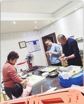 大年三十,魏永亮(右二)和家人与同事一起包饺子。
