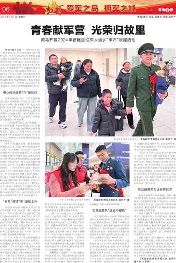 早报3月1日讯 “一朝报国从戎,一世英雄本色。今日荣归故里,他日再护山河。”3月1日起,2024年春季自主就业退役士兵陆续返乡,青岛市退役军人事务局组织开展“荣归”系列欢迎活动,在青岛胶东国际机场、青岛火车站、青岛北站、青岛地铁等多个交通枢纽及退役军人服务中心(站)设置返乡接待站,让退役士兵在返乡后第一时间感受到来自家乡的温暖与关爱,大力营造“参军光荣、退役荣光”的浓厚氛围。青岛早报记者与迎接队伍一同等待,见证退役士兵重回家乡、与家人团聚的温情感人时刻。