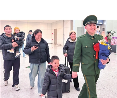 一大早,韩洪岩一家人就带着鲜花和欢迎横幅来到机场,胶州市退役军人应急救援队的其他志愿者也送上了真挚的祝贺。“儿子从小就心怀报国梦,2022年大学毕业后就报名参军了,已经整整两年没回家,现在心情特别激动,今天我们一大家子差不多都来了,他奶奶在家里准备好一桌子菜等我们接他回家团圆。”韩洪岩告诉记者,他们为儿子李鹏程这几年的参军生涯深感自豪,家就是国,国就是家,为国尽忠就是为家尽孝,这种使命感也在整个家庭中传承。
