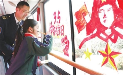 “青岛巴士”志愿服务团队志愿者和小学生一起彩绘“学雷锋”主题车厢。
