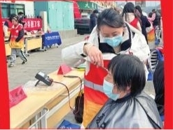 志愿者在沙子口街道志愿服务大集上为居民免费理发。