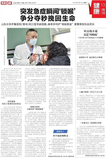 青岛市第三人民医院耳鼻咽喉头颈外科主任杨嵘说,会厌是咽喉要道的重要关卡。我们张开嘴照镜子的时候是看不到会厌的,会厌是要通过喉镜才能观察到。会厌起着非常重要的作用,平时会厌是张开的,空气可以自由出入气道,当我们吃饭吞咽时,会厌像盖子一样盖住气管,不让食物进入气管。急性会厌炎是耳鼻咽喉科的急重症之一,又称声门上喉炎,主要累及喉部声门上区的会厌及其周围组织,以会厌高度水肿为主要特征。该病起病突然、发病迅速,可快速导致急性窒息,死亡率甚高,儿童及成人皆可出现。